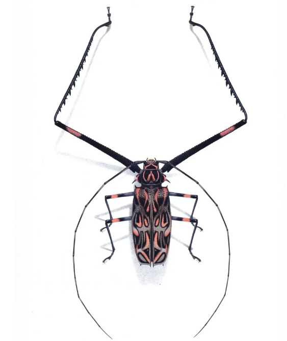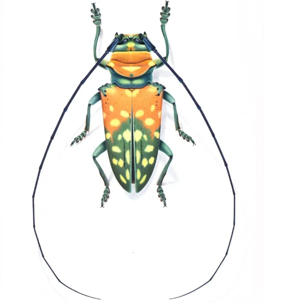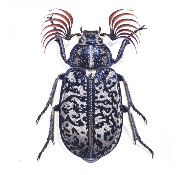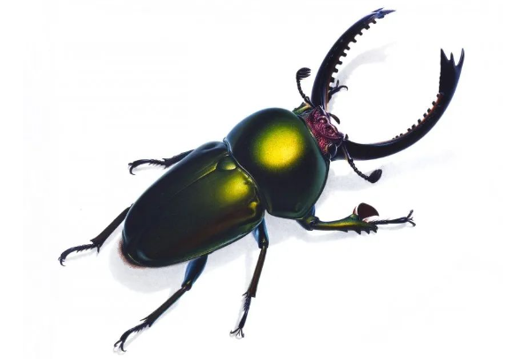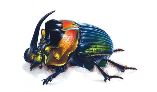 杜林的作品风格独特,精确度和艺术性兼具。他的画作细致入微、生动细腻,每根鬃毛、每个毛孔、每根棘刺都清晰可见,仿佛昆虫就在眼前跃动。其中,南美的帝王突蜣螂、长颈鹿象鼻虫、毕加索球盾蝽、长臂丑角天牛、龙眼鸡、茎甲等代表作品,更是将昆虫的奇妙形态与色彩展现得淋漓尽致,令人叹为观止。