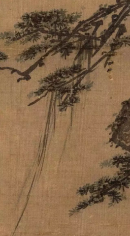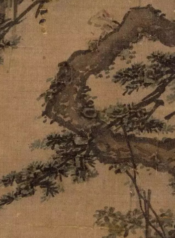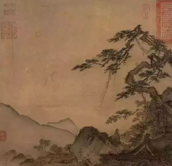 《长松山水图》是南宋画家马麟的传世经典之作,也是南宋院体山水画的代表作之一。这幅画作纵25.1厘米,横26厘米,现藏于美国大都会艺术博物馆。画面以山崖蜿蜒转入山寺的路上为背景,一位高士流连于山水之间,在一株爬满枯藤的古松之下徜徉,仿佛与起伏的远山融为一体,构成了一幅人与自然合而为一的完美景象。