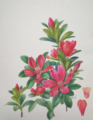 而提及四季花开不败的奇迹,杜鹃红山茶无疑是一个响亮的名字。作为国家一级保护植物,它不畏寒暑,全年绽放,被赋予了“四季红山茶”的美誉。在余峰的画笔下,杜鹃红山茶的花朵娇艳欲滴,仿佛在诉说着生命的坚韧与不屈。