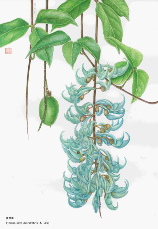 此外,翡翠葛以其独特的生长习性和观赏价值,成为了垂直绿化的优选材料。它的花朵如同悬挂的宝石,点缀在潮湿森林的溪边,为大自然增添了一抹亮丽的色彩。刘运笑的画作中,翡翠葛的灵动与生机跃然纸上,仿佛能听到溪水潺潺,感受到自然的呼吸。