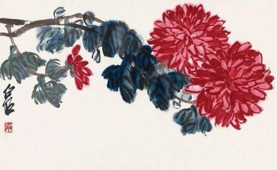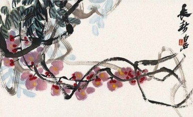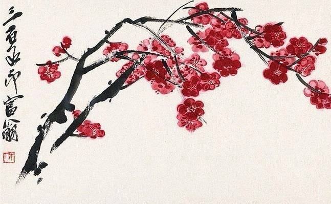 《红梅》则以其大胆而肯定的落笔、精熟的运笔以及浓墨写出的枝干赢得了人们的赞叹。梅花朵朵有如红烛,花枝交错,互为呼应,整幅作品设色清丽而淡雅,山间逸韵顿现于此。
