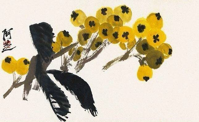 册页中的《枇杷》以没骨法画出果实,设色藤黄,淡墨做枝,浓墨为叶,看似简单却充满了生机与活力。对角构图的巧妙运用使得果实之间枝条穿插得体,看去饱满和谐,又鲜艳欲滴。