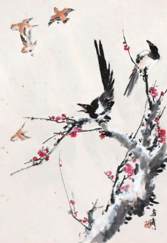 在王雪涛的喜鹊作品中,最为著名的莫过于他的《红梅喜鹊图》。这幅作品创作于1979年的新年,是其晚年时期的精心之作。画面中,红梅与喜鹊相得益彰,共同构成了一幅寓意深远的美好图景。红梅象征着坚韧不拔、不屈不挠的精神品质,而喜鹊则寓意着喜庆、吉祥、幸福和好运。王雪涛通过巧妙的色彩搭配和构图布局,使得整幅画作既符合时代特色,又不失文气。红梅的绚烂与喜鹊的灵动相互映衬,形成了一种和谐而美妙的视觉效果。