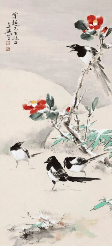 王雪涛在描绘喜鹊时,注重写生,善于捕捉大自然的生机与灵动。他常常去观察各种禽鸟,掌握了禽鸟的各种生活习性,并且能够抓住禽鸟灵动的瞬间动态,将其刻画得细致入微。因此,他笔下的喜鹊,无论是羽毛的质感、姿态的优雅,还是眼神的灵动,都栩栩如生,仿佛随时都会从画中飞出。