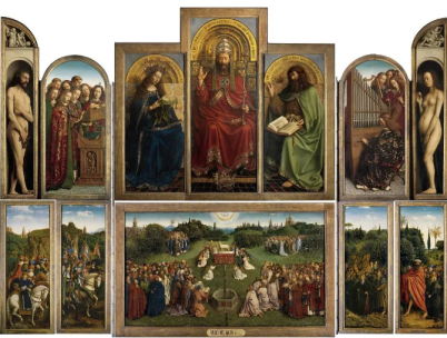 扬·凡·艾克最著名的作品之一是与兄长胡伯特共同完成的《根特祭坛画》。这幅祭坛画是为根特市长约多库斯·威德订制的教堂屏风画,从1415年开始绘制,直至1432年完成,历时18年之久。祭坛画全部完成后,共有20个画面,是当时最负盛名的一件教堂艺术品,标志着人文主义艺术的诞生和美术新时代的开始,奠定了尼德兰文艺复兴的基础。由于《根特祭坛画》首次运用油画颜料绘制,凡·艾克兄弟因此被认为是现代油画的奠基人。
