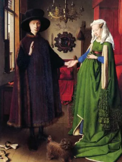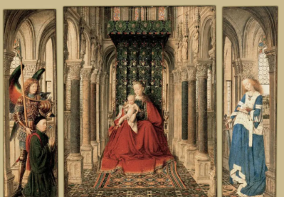 除了《根特祭坛画》外,扬·凡·艾克的其他代表作品还包括《阿尔诺芬尼夫妇像》(1434)、《罗林的圣母》(1435)等。这些作品充分展示了他对空间、光线以及细节、质感的高超把握。在《阿尔诺芬尼夫妇像》中,扬·凡·艾克不仅真实地描绘了典型的资产者形象,而且对室内的环境什物作了极其逼真的描绘,显示了画家特殊的造型才能。这幅画中的象征物既有基督教的信仰,又有世俗的观念,画家都一一收入画中,作了极为细致的描绘。