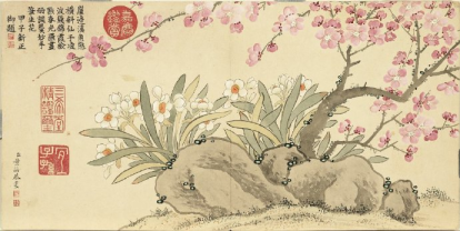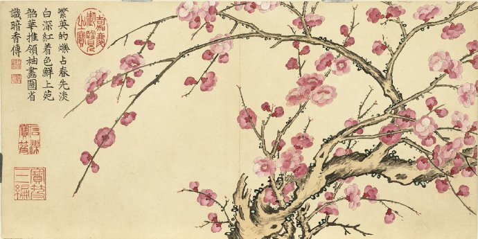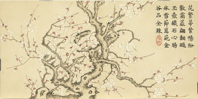 在《瑶圃先春图》中,董诰运用细腻的笔触和丰富的色彩,生动地描绘了瑶圃中万物复苏的景象。梅花作为冬春之交的信使,以其清雅俊逸的风姿、冰清玉洁的风骨、凌寒留香的气节,被历代文人士大夫所喜爱。画中,梅花古干虬枝、仙姿凛然,姿态或向上、或横斜、或下垂、或龙游,遒劲有力,疏密有致,仿佛在传达着一种鼓舞人心的力量。