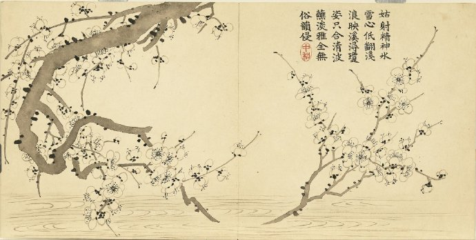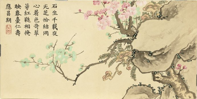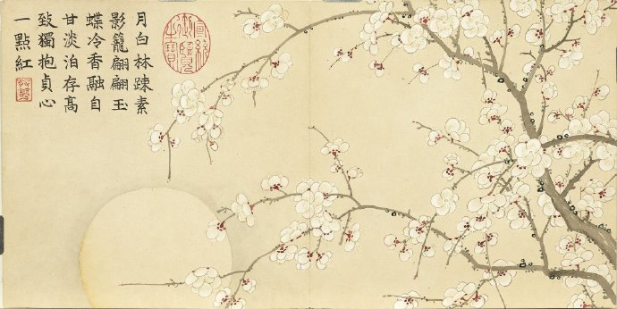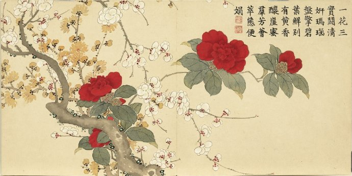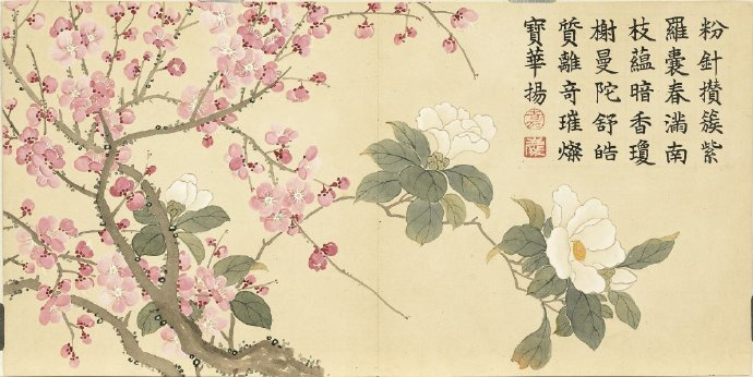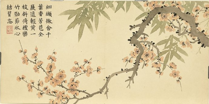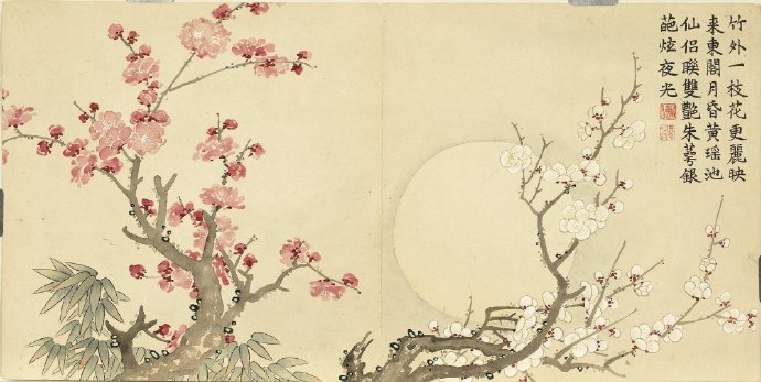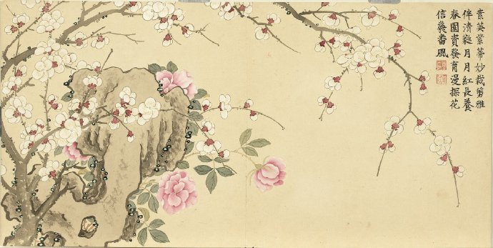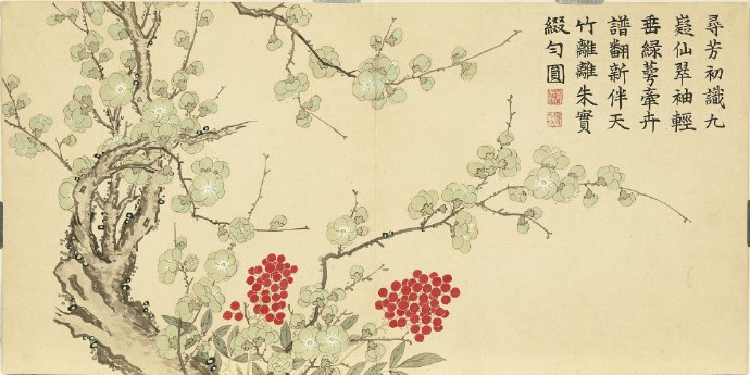 《瑶圃先春图》册以梅花为主题,共十二开,分别描绘了红梅花、月映梅花、绿萼梅天竹、黄梅绿竹、梅花月季、临水梅花、梅花腊梅山茶、红绿梅花芝草、红梅栀子花、古梅、梅花竹叶、红梅水仙等景致。这些画作均创作于清嘉庆九年,现藏于台北故宫博物院。每幅画作不仅展示了梅花的各种风姿,还配以清仁宗嘉庆帝的御制诗,使得这幅画册更具文化价值。
