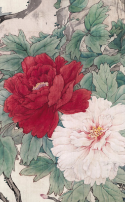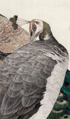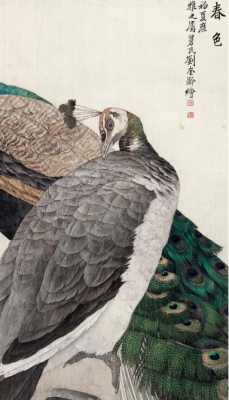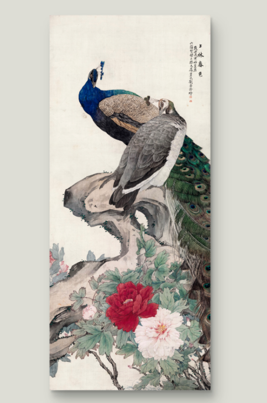 《上林春色图》以春天为背景,描绘了一幅生机勃勃、春意盎然的景象。画面中,孔雀开屏,羽毛绚丽多彩,形态逼真,仿佛能听到其清脆悦耳的叫声。周围的牡丹花团锦簇,设色清雅,与孔雀的艳丽羽毛相映成趣,共同构成了一幅华美的图画。尤其是孔雀的羽毛,刘奎龄运用了渲染和丝毛相结合的技法,使羽毛非常逼真且具有质感,令人叹为观止。