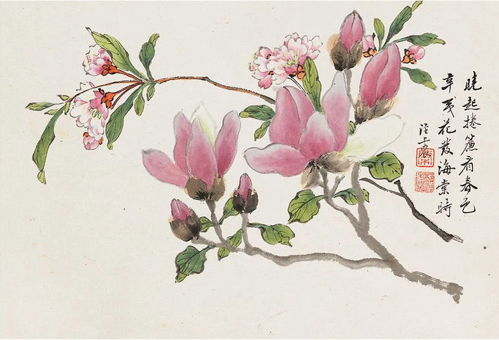 这并非一幅幅严谨的植物图谱或鸟类图鉴,而是一曲对自然的赞歌,一首用色彩和线条吟咏的生命之诗。你看那月季,粉红的花瓣层层叠叠,娇艳欲滴,仿佛还能嗅到那淡淡的幽香;那凌霄花,橙红色的花朵如同火焰般攀援而上,充满了蓬勃的生命力;那芙蓉,在晨曦中绽放,清丽脱俗,宛如一位不施粉黛的美人。还有那傲立寒冬的腊梅,点点金黄,散发着清冷的芬芳,让人感受到生命的坚韧与高洁。