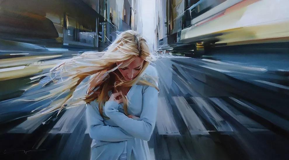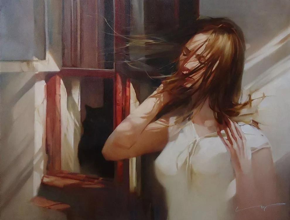 我第一次看到他的作品,就被深深吸引。那并非是惊艳的、夺目的美,而是一种娓娓道来的、沁人心脾的美。他的画中女子,或静坐窗边,眼神中流露着淡淡的忧郁;或行走在田野间,裙摆飞扬,仿佛带着泥土的芬芳;或轻抚琴弦,指尖流淌出悠扬的旋律……她们并非完美无瑕,却有着真实而动人的生命力。