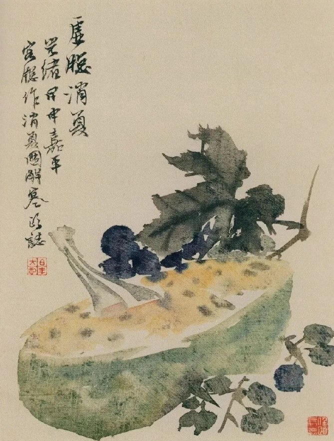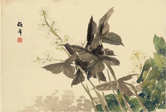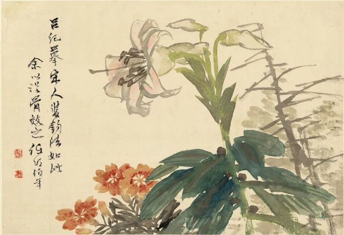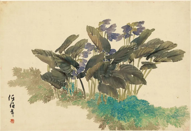 若论任伯年的个人艺术造诣,花鸟画堪称一绝。他的花鸟画充满了创造与巧趣,早年以工笔见长,仿北宋人法,焦墨钩骨,赋色肥厚,近似老莲派。后来,他又吸取恽寿平的没骨法,陈淳、徐渭、朱耷的写意法,笔墨愈发简逸放纵,设色明净淡雅,形成了兼工带写、明快温馨的格调。这种画法,如同在花鸟画的天地中开辟了一片新大陆,对近、现代画坛产生了深远的影响。