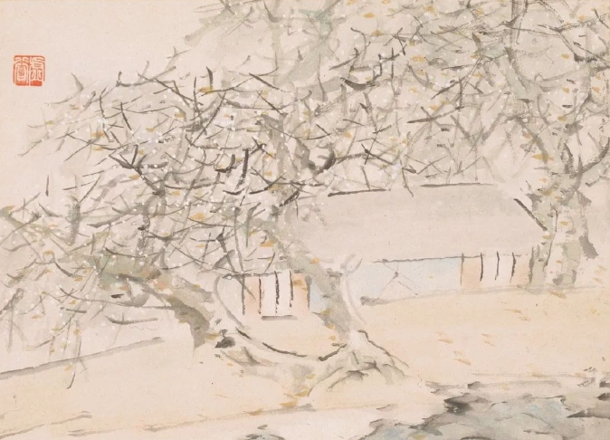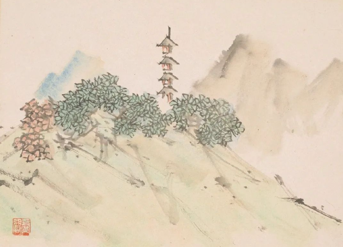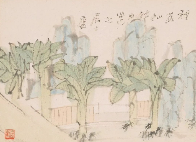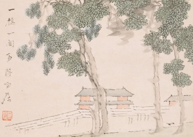 虚谷的敷色淡雅,重视色调的统一与淳朴的美感。他善于在色纸上使用白粉,让白色的荷花、仙鹤毛片和兰花显得栩栩如生。他的界画成就也极高,如《瑞莲放参图》《重建光福寺全景图》等,尤其是为普陀山普济寺所作的十二帧写实山水册页,堪称界画与传统画融合的神品。