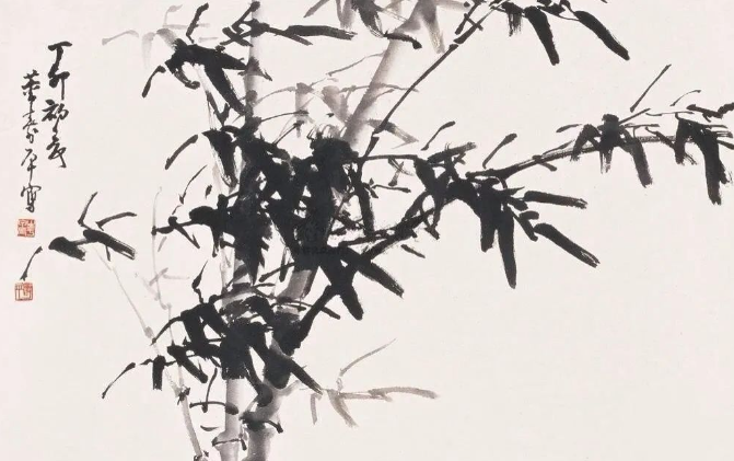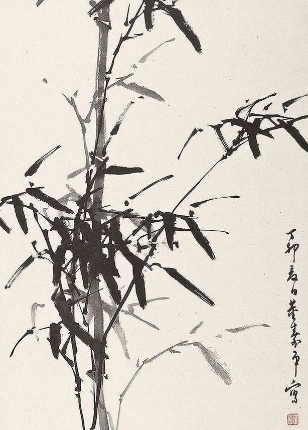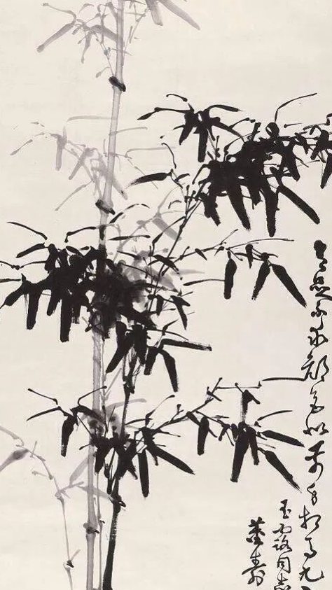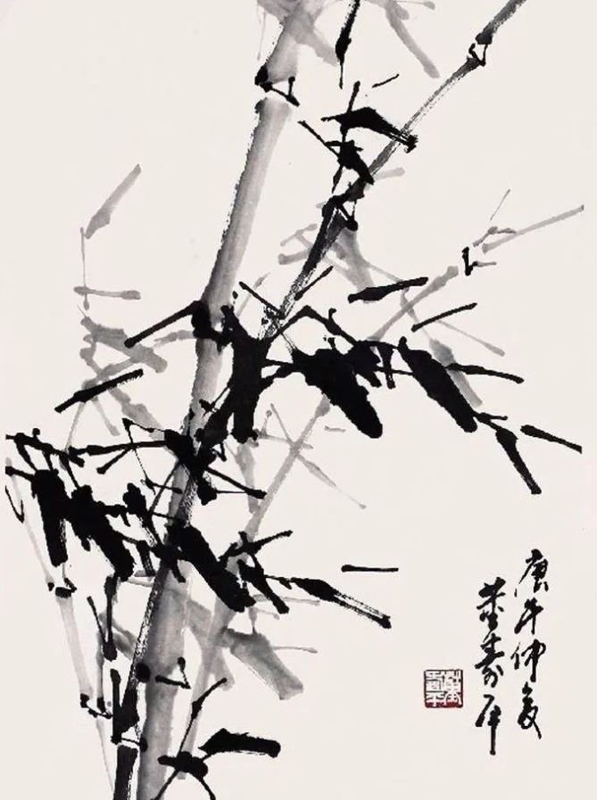 在他的笔下,竹子的千姿百态被展现得淋漓尽致。风中的竹,枝叶随风摇曳,姿态婀娜,仿佛在翩翩起舞,灵动而富有诗意;晴日下的竹,枝叶挺拔,疏落有致,透出一种欣欣向荣的生命力,笔墨间洋溢着欢欣与喜悦;雨中的竹,枝梢低垂,叶片下偃,苍翠欲滴,仿佛能听到雨滴落在竹叶上的清脆声响;而雪中的竹,则更为动人,枝叶下垂,用大笔淡墨衬出背景,枝叶上留白处仿佛是积雪,寒气逼人,展现出竹子傲雪不屈的品格。