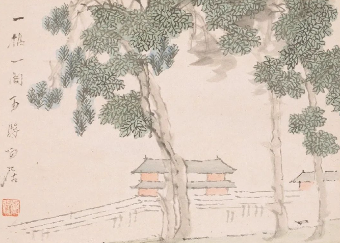 他的敷色淡雅,重视色调的统一与淳朴的美感。他善于在色纸古金笺上使用白粉,使那些白色荷花、仙鹤毛片和白粉含石绿的折枝兰花等,显得栩栩如生。他的界画成就也极为突出,他的《瑞莲放参图》《重建光福寺全景图》等作品,是界画与传统画融合的神品。