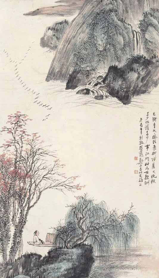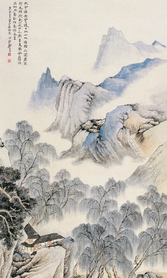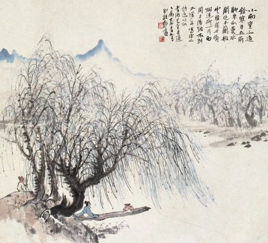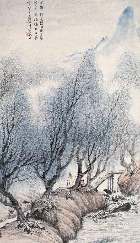在国画的浩瀚天地里,画树向来被视为难题,而画柳更是难上加难。然而,郑午昌却偏偏在这柳树的笔墨间,舞出了别样的风姿。他的山水画中,柳树如诗如画,成为他作品中一道独特的风景。他曾题诗道:“画树难画柳,艺苑悬为警语。”可在他笔下,画柳却如同自然流淌的溪水,自干生枝,自枝生叶,随意挥洒,便无墨碍。那千丝万缕的柳枝,细而不弱,密而不乱,丽而不俗,仿佛是天成之美,而不仅仅是人力之功。