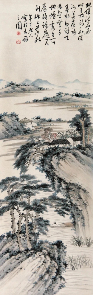 陈半丁的山水画,宛如一场穿越时空的对话。他从“四王”入手,又在石涛的画风中汲取灵感,却并不拘泥于具体的形迹,而是以一种灵动的心意去捕捉艺术的精髓。他的画作,苍润秀美,简约疏放,仿佛是大自然的低语,又似岁月的轻吟。他将宋元的古意融入其中,让每一幅画都充满了历史的厚重与岁月的悠长。
