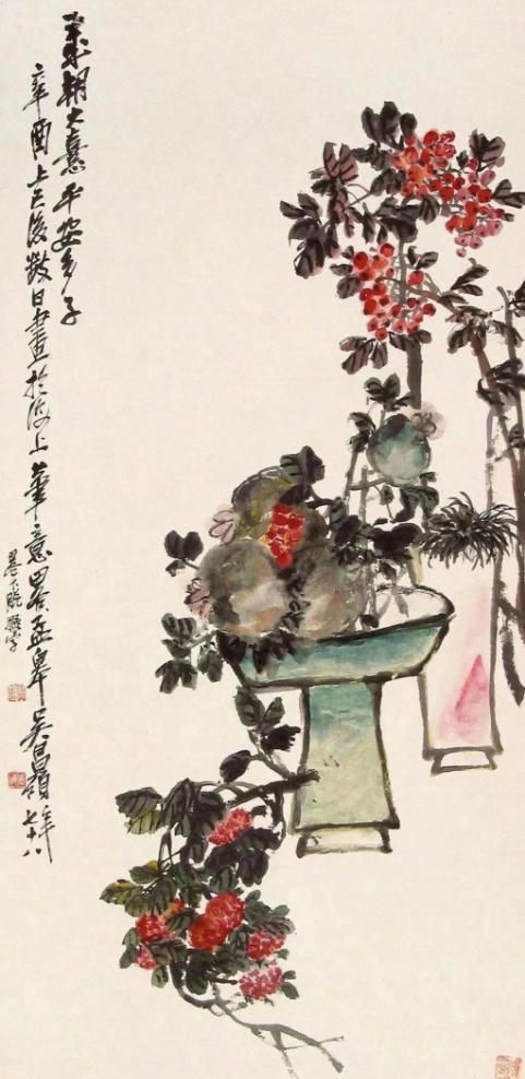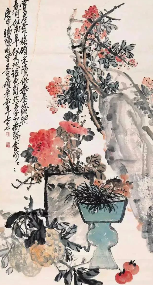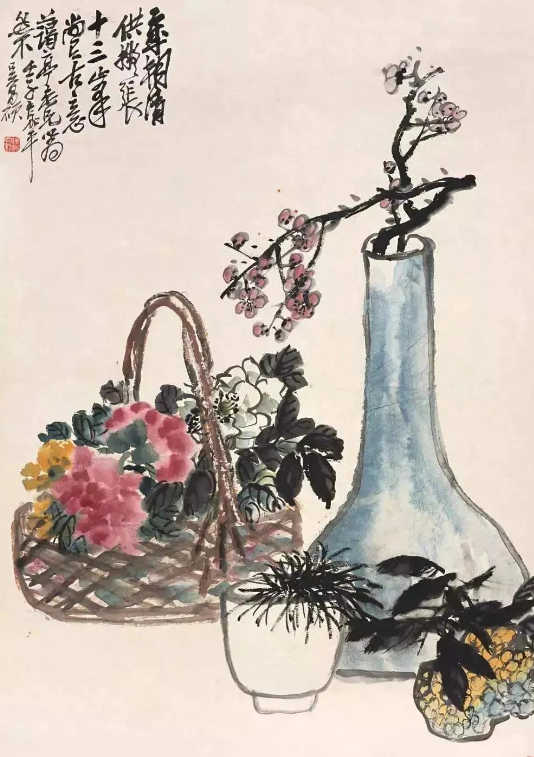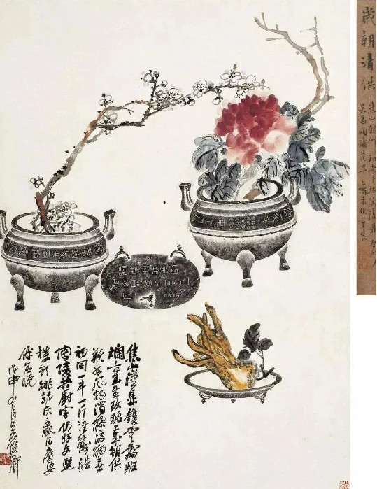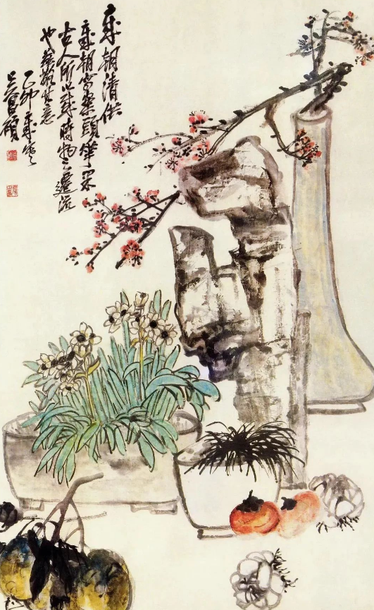 吴昌硕在构图上也独具匠心。他将物品高下低昂、错落有致地安排于画面,常用右高左低的对角形式排列,再配以题识和印章,使整幅画作既大气又不失精致。这种精巧的构图,如同一场精心编排的舞蹈,每一个动作都恰到好处,展现出画家大气磅礴而又细腻入微的艺术风范。