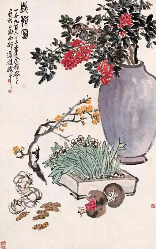 在欣赏《岁朝图》时,我们仿佛能穿越时空,与画家一同站在那个新春的清晨,感受那份对生活的热爱与对未来的憧憬。这幅画,不仅仅是一幅作品,更是一扇窗,透过它,我们看到了吴昌硕心中的世界——一个充满诗意与温暖的世界。