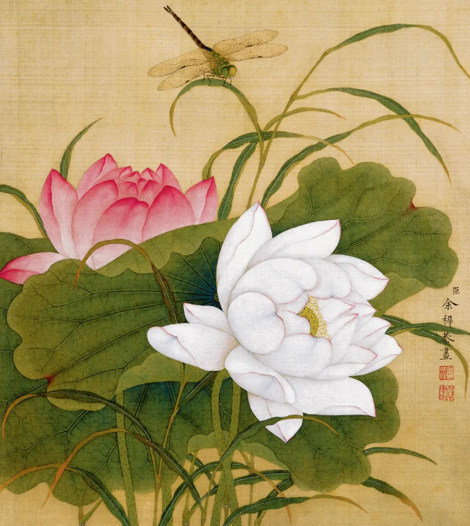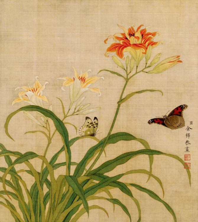 余稚的代表作《余稚花鸟图册》是其艺术成就的集中展现。这本图册共十二开,描绘了兰花、牡丹、萱花、百合花、荷花、秋菊、桃花、海棠、玉兰、梅花、腊梅等花卉,以及蜜蜂、画眉、黄莺、绶带、麻雀等虫鸟。这些作品不仅展现了丰富的自然元素,更体现了余稚对细节的精准把握和对自然的深刻理解。