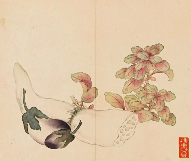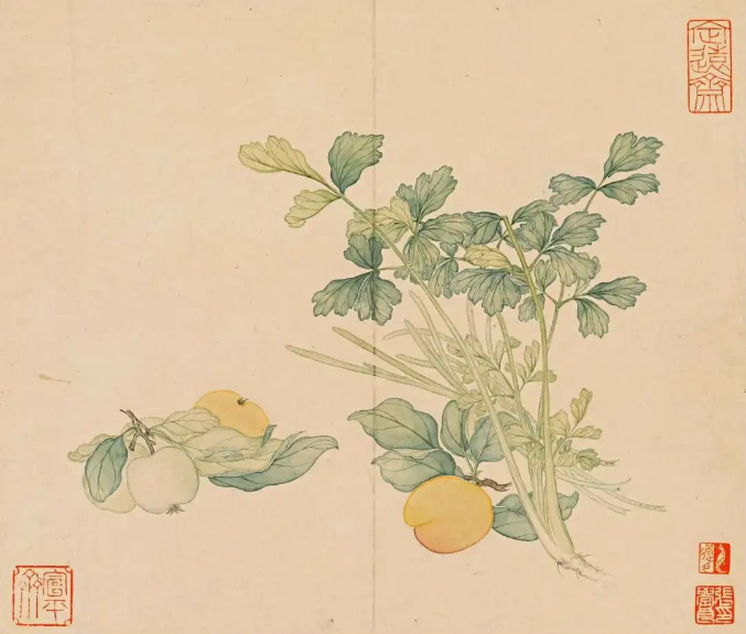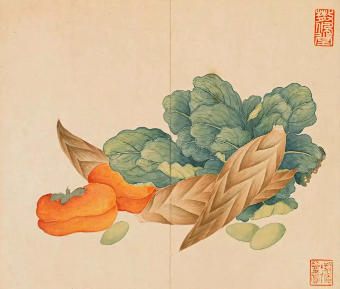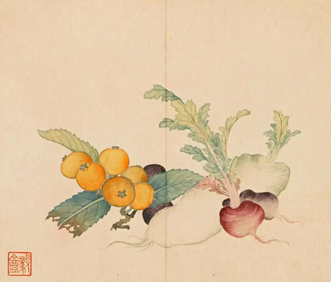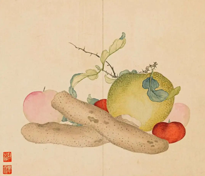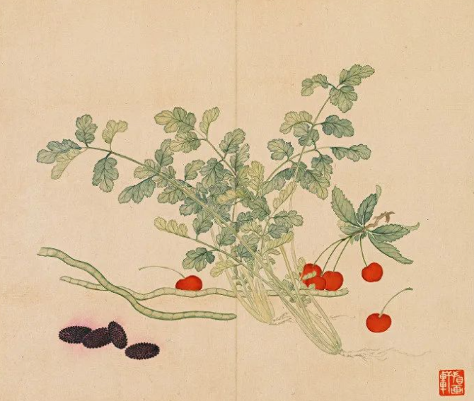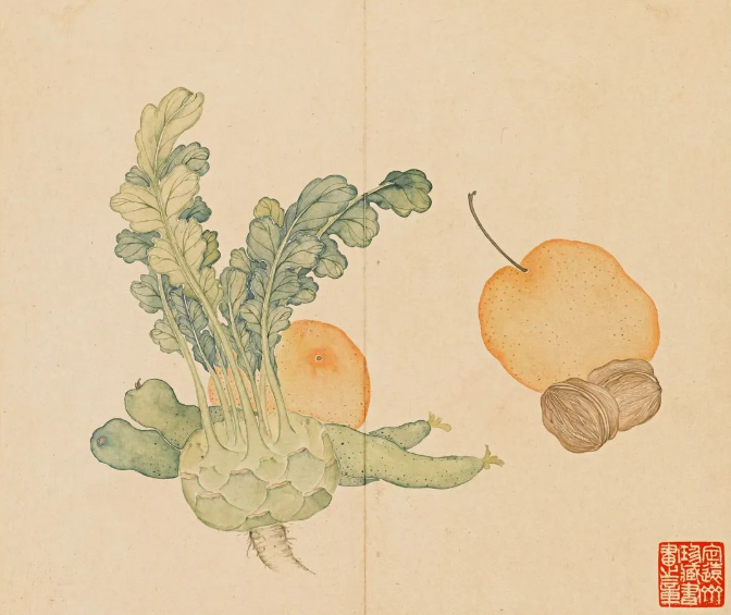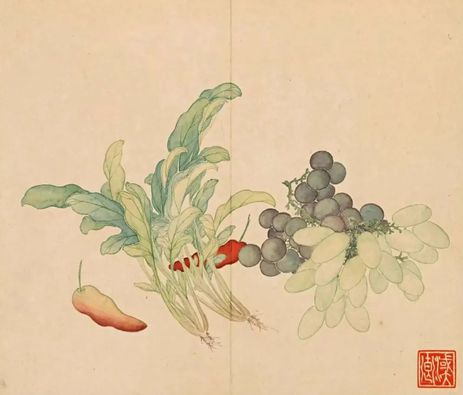 汪承霈的这幅《果蔬杂卉册》,宛如一幅清新脱俗的田园诗,将寻常果蔬绘于纸上,却赋予了它们非凡的生命力。画中,山药、萝卜、莲蓬、豆荚、竹笋、石榴、藕、茄子、葡萄、柿子、樱桃、香菜等,这些平日里触手可及的食材,在他的笔下变得鲜活起来。他以细腻的笔触勾勒出果蔬的轮廓,再用淡雅的色彩层层晕染,每一笔都似在诉说着自然的馈赠。那山药的质朴、萝卜的清脆、莲蓬的静谧、豆荚的饱满,仿佛从纸上跃出,带着泥土的芬芳与露水的清凉,让人不禁心生向往。