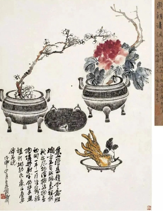 《岁朝图》的构图,更是吴昌硕独特艺术风格的完美展现。他将物品高下低昂、错落有致地安排于画面,常用右高左低的对角形式排列,再配以题识和印章,使整幅画作大气磅礴而又不失细腻。这种精巧的构图,如同一首优美的诗,每一个字、每一句话都恰到好处,让人回味无穷。