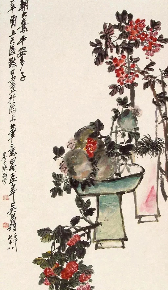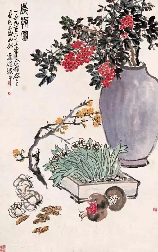 吴昌硕的《岁朝图》,是他创作鼎盛期的杰作,仿佛是新春佳节里的一首欢歌,充满了吉祥与祝福。画中,花果器物错落有致,石榴象征着多子多福,花瓶寓意着平安祥和。每一笔每一划,都透露出画家对生活的热爱与对美好未来的憧憬。那笔法,稳健而苍老,却又不失灵动与洒脱;设色俏丽鲜艳,雅妍相兼,如同春日里绽放的花朵,绚烂夺目。在这幅画中,我们仿佛能听到岁月的低语,感受到新春的气息,触摸到画家那颗温暖而真挚的心。