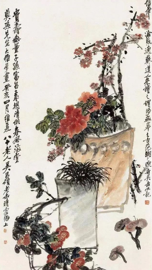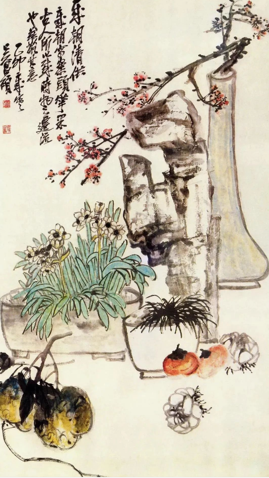 当我们站在吴昌硕的《岁朝图》前,仿佛能穿越时空,与这位伟大的艺术家进行一场心灵的对话。他的画作,不仅仅是一种视觉的享受,更是一种心灵的触动。它让我们感受到了艺术的魅力,也让我们感受到了生活的美好。