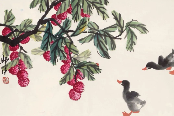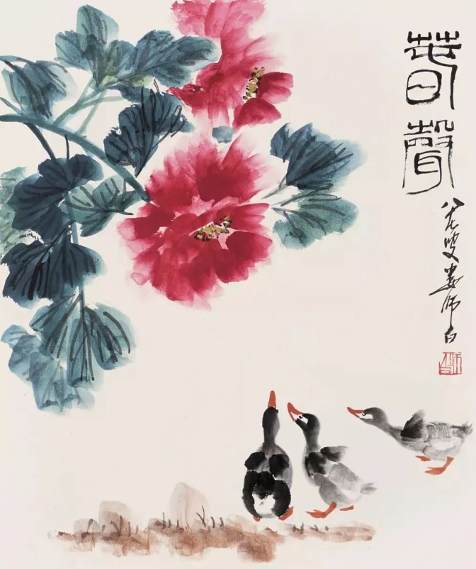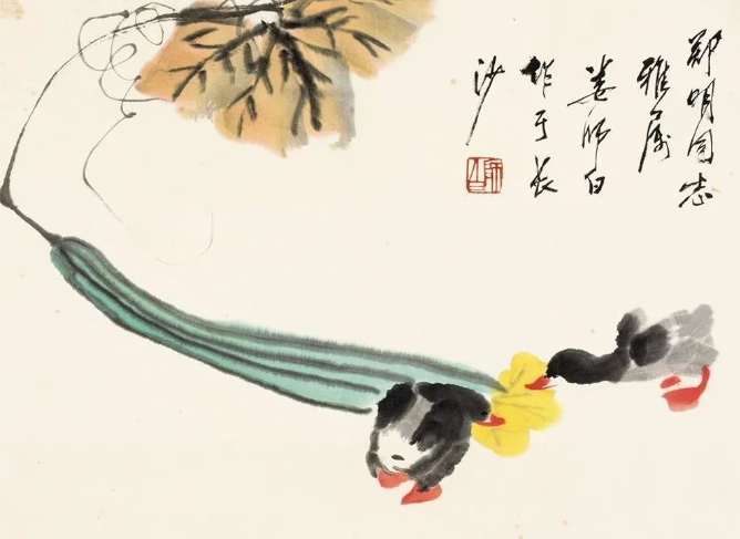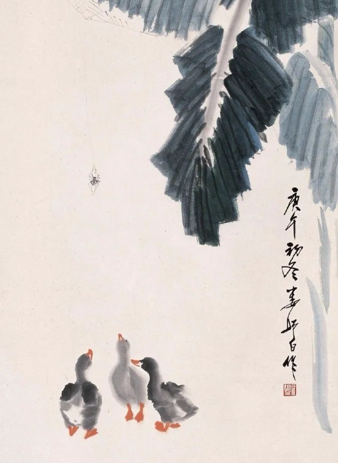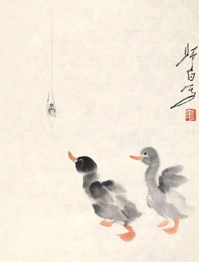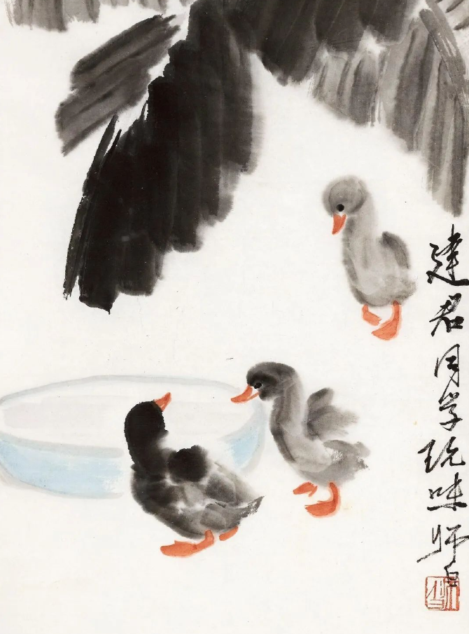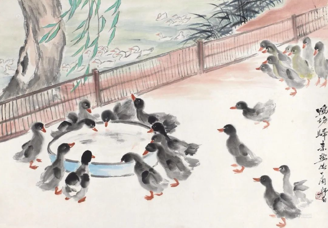 娄师白先生是齐白石的入室弟子,14岁便在齐白石先生家中学习诗书画印,长达25年之久。齐白石的艺术风格深深地影响了他,但他并未止步于此,而是在继承中不断创新,形成了自己独特的艺术风格。他的画作色彩鲜而不艳、雅而不俗,充满了生机与活力,仿佛每一笔都在诉说着生命的蓬勃与美好。他擅长画花鸟瓜果,尤其是小鸭子,更是画得灵动可爱,栩栩如生,让人不禁为之动容。在他的笔下,小鸭子们或在水中嬉戏,或在岸边漫步,那憨态可掬的模样,仿佛跃然纸上,让人感受到了大自然的灵动与和谐。