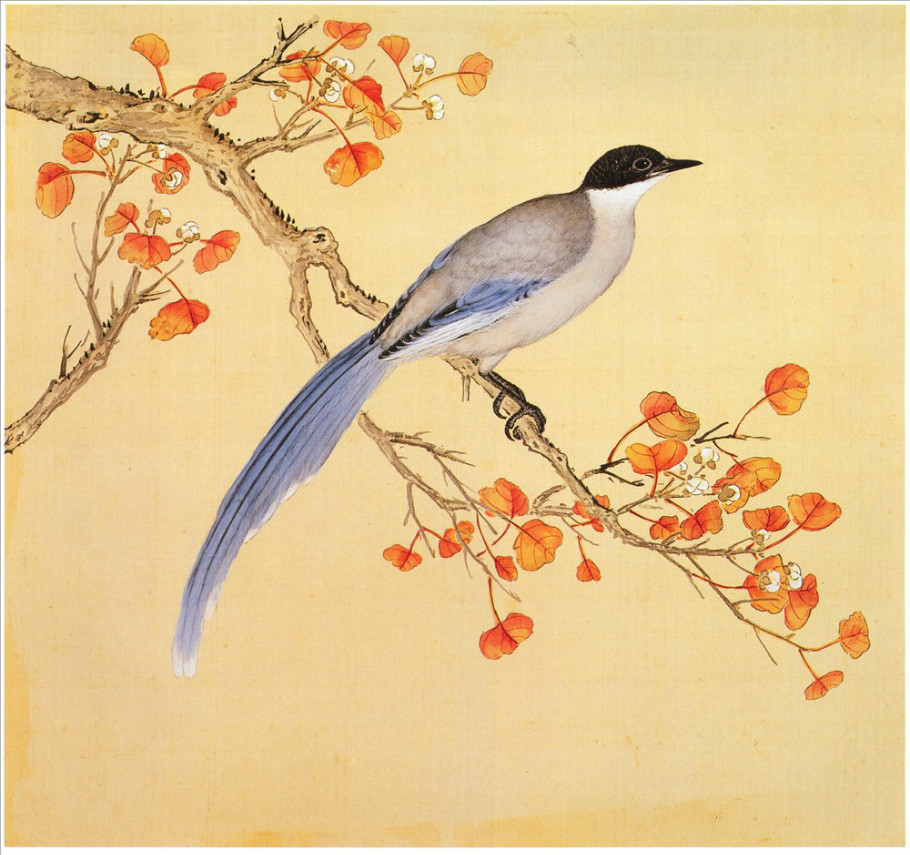 宋徽宗赵佶(1082-1135)在御花园内见一只贡自岭表的别致鹦鹉飞鸣于杏枝间,姿态煞是可爱,遂御笔彩绘,复作诗并序,于是有《五色鹦鹉图》,现藏波士顿博物馆。鹦鹉比例适当,眼睛、羽毛、爪子表现得都非常准确。与西洋博物画相比,《五色鹦鹉图》一点不逊色。赵佶绘制的《芙蓉锦鸡图》更是高水平的博物画。画面左下角为一秋菊(有两枝花序),主画面为约呈60度角的两枝木芙蓉,右上角是翩翩戏飞的双蝶。前景中锦鸡依枝,是此画的主体。右边空白处用瘦金体题诗:“秋劲拒霜盛,峨冠锦羽鸡;已知全五德,安逸胜凫鹥。”诗画合璧的独特呈现,表达的是中国文人审美情趣甚至天人观念,这是西洋画家难以深入领会的。此外,赵佶的《柳鸦芦雁图》,唐代韦銮的《芦雁图》、戴嵩的《斗牛图卷》,宋代李迪的《红白芙蓉》、黄筌的《写生珍禽图》、佚名作者的《桐实修翎图轴》等,都是不错的博物画,质量不亚同期西方国家的作品。某种意义更胜一筹,它们更有灵动感,不那么死性。