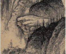 画面中央,三位仙君作揖遥拜,周围栏杆陈设工整,众仙瑶台献寿,场景喜庆。人物神态各异,衣褶勾勒细腻,树石画法则以刚硬的线条勾写,加以斧劈皴,淡墨横抹,使得线条浓厚而突出。松树造型夭矫多姿,松针疏密有致,以墨笔勾勒,再以草绿色间点,更显立体生动。