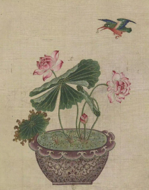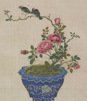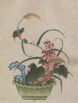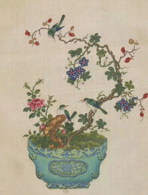 在花鸟之间,还巧妙地镶嵌着英文的签名和印章,这不仅证明了这是一套外销画作品,更彰显了当时中国艺术与西方文化的交融与碰撞。如今,《盆景花鸟图册》被珍藏在法国国家图书馆中,成为了连接东西方艺术的珍贵纽带。它不仅展示了清代中国绘画的高超技艺和丰富题材,更让我们看到了那个时代东西方文化交流的繁荣景象。