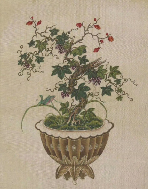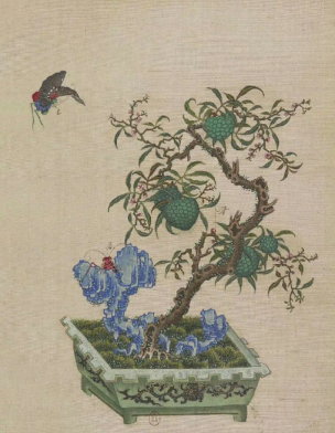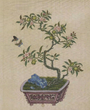 《盆景花鸟图册》绘制于清代,是一套包含一百幅插图的外销画作品。上册以鸟类、花卉为题材,下册则以昆虫、果木为主题,每一幅都如同一幅精美的微型景观,将大自然的生机与美丽浓缩于方寸之间。这些盆景图样不仅展示了中国盆景艺术的精髓,更通过细腻的笔触和丰富的色彩,将各种花卉、果树、鸟虫栩栩如生地呈现在观众面前。