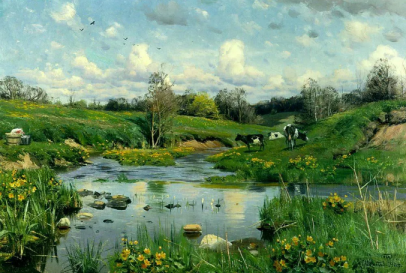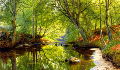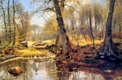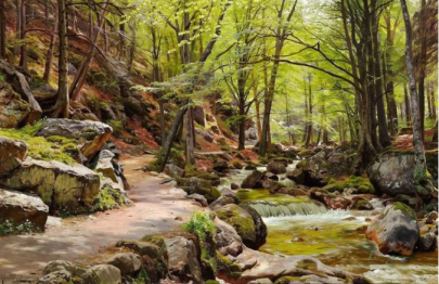 蒙森德的作品主要以风景为主题,尤其是森林、溪流以及他在旅行中见到的各种自然景观。他精湛的技巧和对光影的把握使他的画作充满了生命力和情感。在他的画布上,每一片树叶、每一滴水珠都被赋予了生命,展现了他对自然的深度理解和敬畏。他的画作常常描绘一派祥和的田园风光,安静美好,能够让人如临其境地感受画面中的自然景色,忘却城市中的喧嚣。