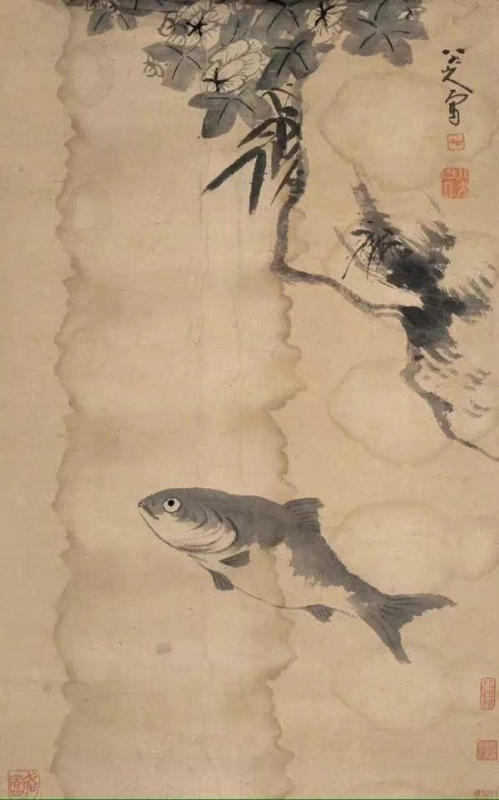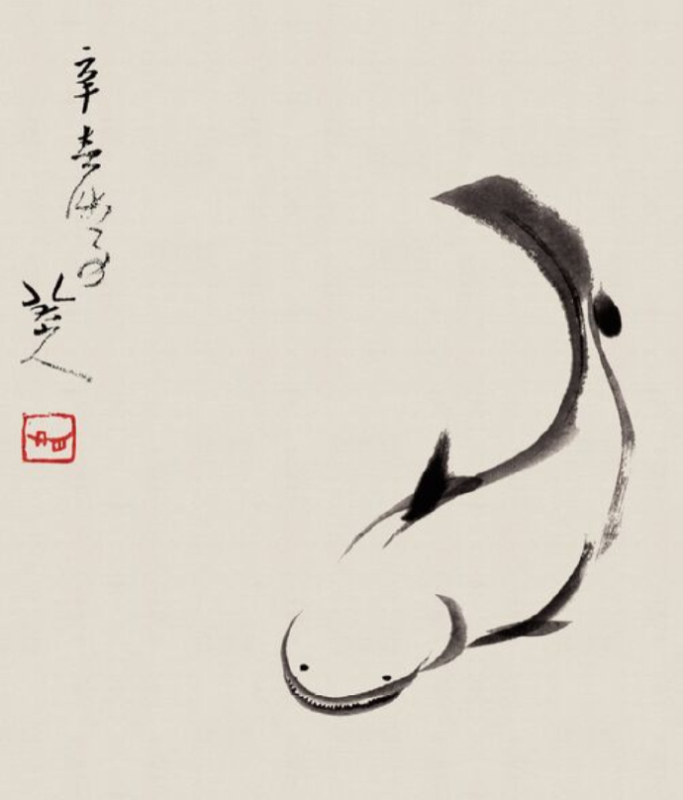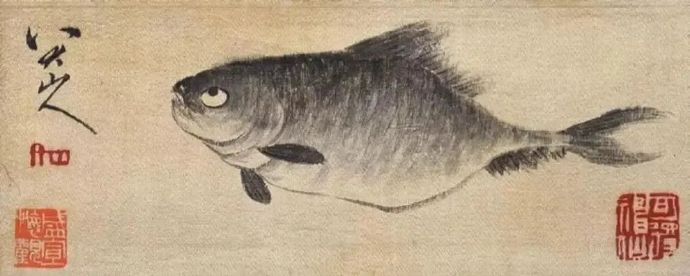 八大山人画鱼时,用极简的构图与用笔,便能充分表现出鱼的神韵。他的笔触简练有力,每一笔都恰到好处,既准确地描绘了鱼的外形特征,又生动地传达了鱼的精神气质。更为独特的是,他画鱼眼时变化多端,白眼向人的表现手法尤为引人注目。这种独特的手法不仅增添了画面的趣味性,更寓意深刻,反映了八大山人内心的孤傲与愤世嫉俗。