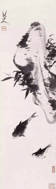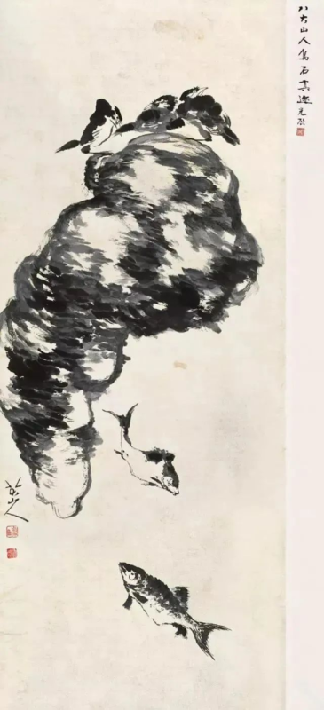 《鱼石图》是八大山人的代表作之一,这幅画中的鱼与石头都显得极为简练,但寓意却十分深刻。画面中的小鱼孤零零地游弋在空旷的水域中,背景只有一块简洁的石头。白眼向人的鱼与孤寂无伴的石头,都是画家内心情感的直接流露。他通过画鱼来寄托自己的情感,表达对现实的不满和对自由的向往。