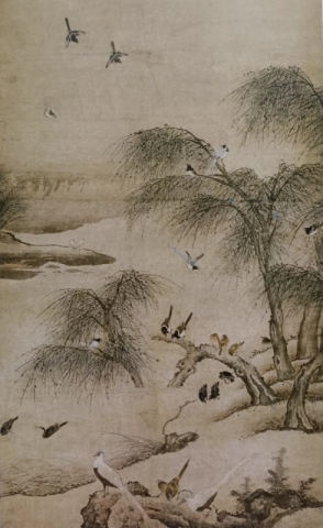 在元代画家夏叔文的笔下,《柳汀聚禽图》以其悠远的构图和古逸的柳树画法,为我们勾勒出一幅春意盎然的自然画卷。