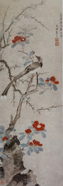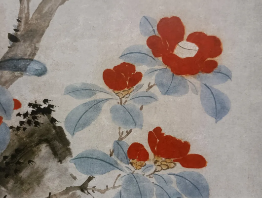 梅枝自然伸展,朵朵梅花点缀其上,茶花争相绽放,一抹红色美艳动人。朱竺运用没骨技法绘制红茶花,落笔干净利落,一气呵成,形成了清雅别致的画面效果,令人叹为观止。