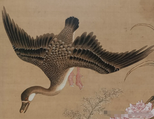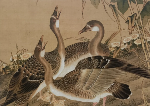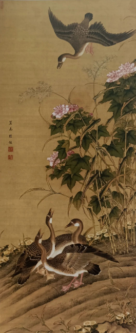 清代画家丘鉴的《芙蓉芦雁图》以其生动的江南苇塘小景和细腻的工笔技法,赢得了人们的喜爱。画中,三只芦雁栖息在芦花芙蓉摇曳生风的沙坡间,它们或引颈仰望,或盘旋空中,或驻足沙坡,形态各异,栩栩如生。