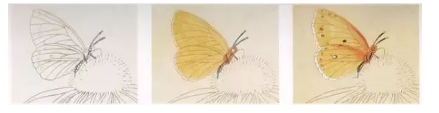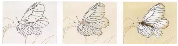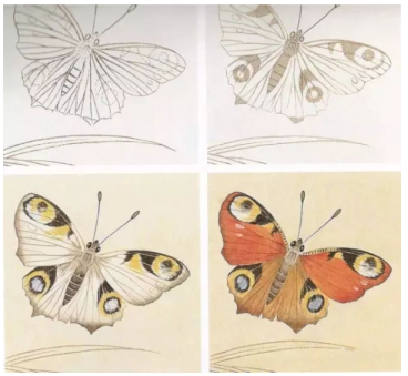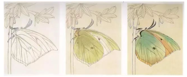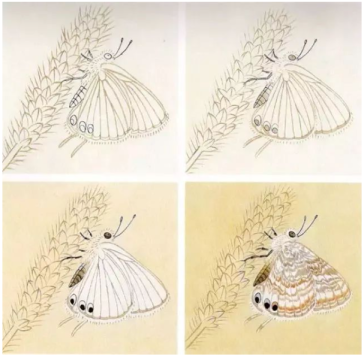 白绢蝶以其洁白的翅膀和优雅的体态而备受喜爱。首先,以重墨勾翅、眼、触角,淡墨勾尾,注意保持线条的清晰与准确。淡墨分染背、尾等部位,用淡草绿和淡橘黄分染翅边缘,形成柔和的过渡效果。最后,以浓白粉提染翅膀,以重墨分染背、尾等部位,再用橘黄色提染细节,使画面更加生动立体。