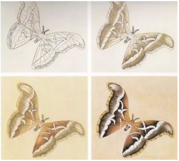 蓖麻蚕体型较大,翅膀宽阔,色彩丰富。先用不同墨色细致勾画其身体结构,注意区分头、胸、腹及翅膀的轮廓。淡墨分染全身,营造柔和的过渡效果。接着,以藤黄分染翅边,赭石色分染翅膀主体,形成鲜明对比。最后,以重墨分染翅上斑纹,白色提染翅上花斑,增添细节与层次感。