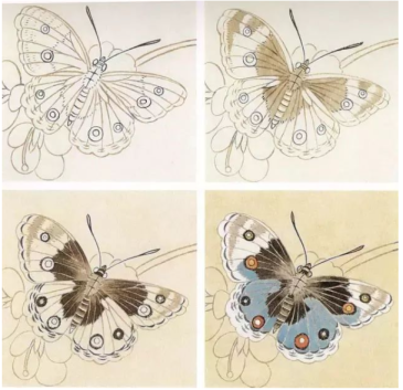大帛斑蝶以其巨大的翅膀和醒目的白色斑纹而引人注目。首先,以重墨勾画全身各处,注意保持线条的清晰与准确。淡墨罩染翅上花斑,形成柔和的底色。接着,以重墨提染翅上花斑,花青色分染翅根,增强视觉冲击力。最后,以白色提染翅上白斑,藤黄点染眼、腹部,使画面更加生动传神。