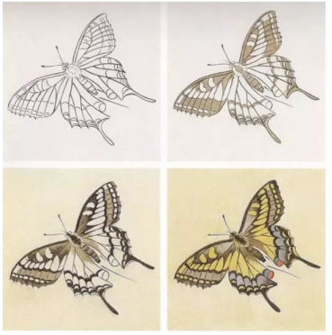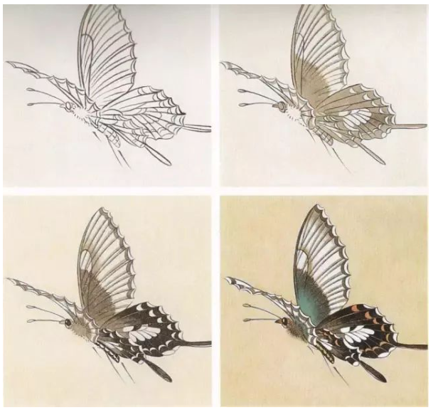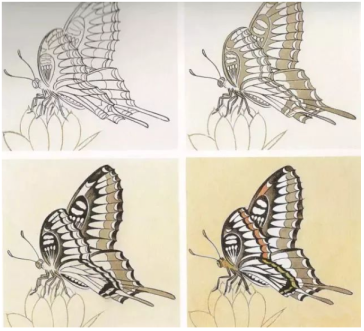 金凤蝶以其金色的翅膀和华丽的尾突而闻名。首先,以重墨勾画全身各处,注意保持线条的流畅与力度。淡墨罩染全身,营造轻盈的质感。接着,以重墨分染翅膀边缘及身体细节,增强立体感。最后,以藤黄色、朱磦色和三青色点染翅上花斑,形成丰富的色彩层次。