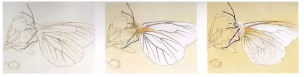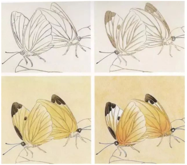 菜黄蝶以其明亮的黄色翅膀而著称。首先,以不同墨色勾画身体各部分,注意保持线条的细腻与准确。淡墨分染全身,营造柔和的过渡效果。接着,以黄色分染翅膀主体,形成明亮的底色。最后,以浓白色分染翅边,鹅黄色分染翅根,草绿色分染腹部,使画面更加生动立体。