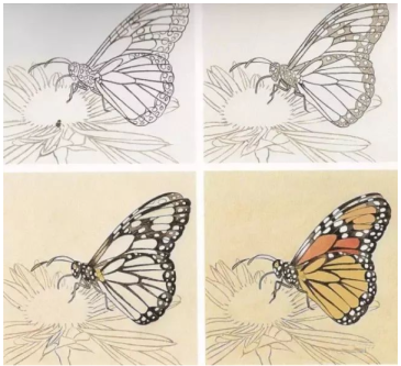 君主斑蝶以其醒目的黑色与橙色相间条纹而著称。首先,以不同墨色勾画身体各部分,注意保持线条的清晰与准确。淡墨罩染全身,营造柔和的过渡效果。接着,以大红和朱磦色分染翅膀主体,米黄色分染翅边,形成鲜明的色彩对比。最后,以白色提染翅上白斑,增强细节与层次感。