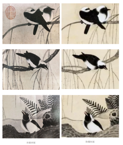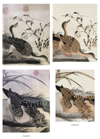 后段的芦雁在芦草蓼花边栖息,以浅赭设色,营造出秋天萧疏的氛围。陈佩秋在临摹此画时,深得徽宗笔墨之精髓,全画设色浅淡,构图洗练,栖鸦与芦雁精细工整,神采奕奕。她的笔触流利畅达,运笔圆润健韧而富弹性,墨色前后层次分明,整个画面恬静雅致、神静气闲,既保留了皇家之贵气,又不失自然之妙韵。