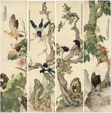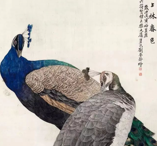 刘奎龄以翎毛画著称,他的翎毛画作品栩栩如生,形态各异。他善于观察自然,将翎毛的细腻纹理和生动形态完美地呈现在画布上,令人叹为观止。他的翎毛画不仅技艺高超,更在于他对艺术的执着追求和不断创新。他将西方美术文化渗透到中国博大精深的传统国画中,最终成为中国画坛翎毛第一人。