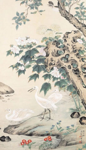 临明吕纪秋水群雀图/155cm×80cm/ 20 世纪 40 年代/杭州芸廷美术馆藏