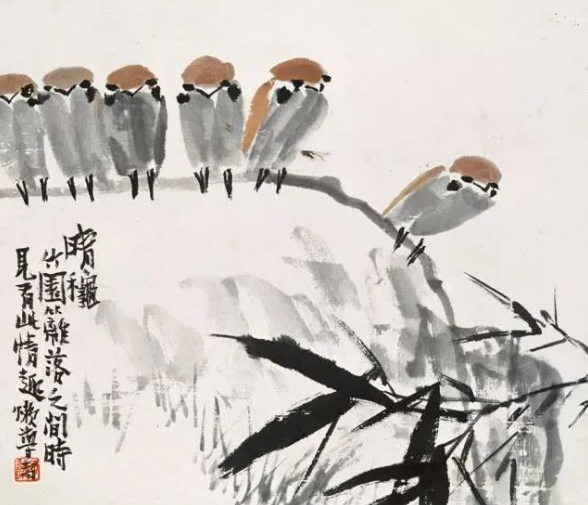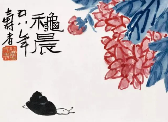 潘天寿的构图不仅严谨,而且富有创意。他善于打破传统的构图模式,通过大胆的构思和独特的视角,创造出令人耳目一新的画面效果。他的画作中,常常出现一些出人意料的元素和组合,这些元素和组合在视觉上形成强烈的冲击力和节奏感,给人以深刻的印象。他的这种构图方式,不仅丰富了画面的表现力,更提升了作品的艺术价值。