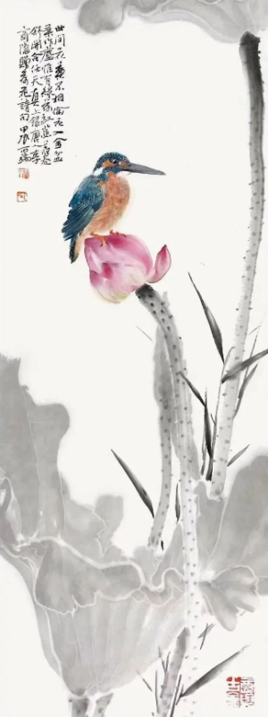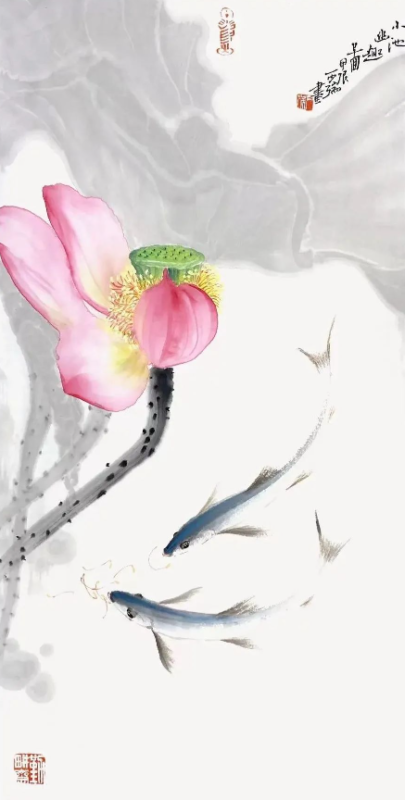在构图上,郭丙端更是独具匠心。他善于运用简洁而富有变化的构图方式,营造出空灵、悠远的意境。有的作品中,一朵盛开的荷花独自占据画面的中心位置,周围辅以寥寥几片荷叶,大面积的留白给人以无限的遐想空间,仿佛这朵荷花正生长在一片广阔无垠的荷塘之中,周围是澄澈的天空和流动的空气。而在另一些作品中,他则会描绘一群荷花错落有致地分布在画面中,盛开的、含苞待放的、凋谢的莲蓬相互映衬,构成了一幅丰富多彩的荷塘画卷。